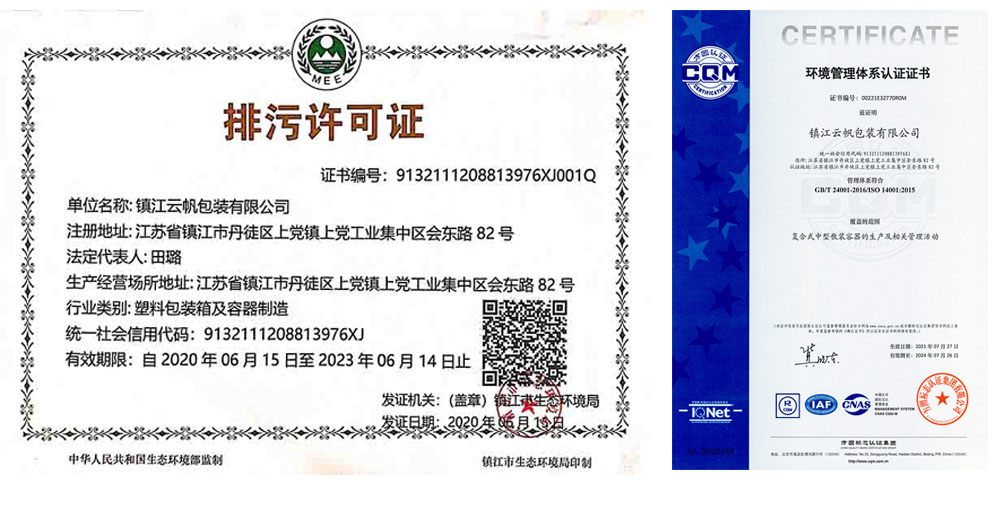 鎮江云帆包裝有限公司,統一社會信用代碼9132111208813976XJ,法定代表人:田璐,生產地址:鎮江市丹徒區上黨鎮上黨工業集中區會東路82號,主要從事復合式中型散裝容器的生產及銷售。于2020年6月15日取得排污許可證,主要污染物為非甲烷總烴及顆粒物,排放濃度及總量均未超標,相關檢測報告見附件。另我司已于2020年4月完成環境保護驗收工作,并于2021年7月27日取得環境管理體系認證證書。